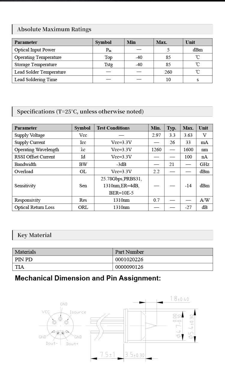 25Gbps PIN-TIA 1310nm TO-CAN Series photodiode