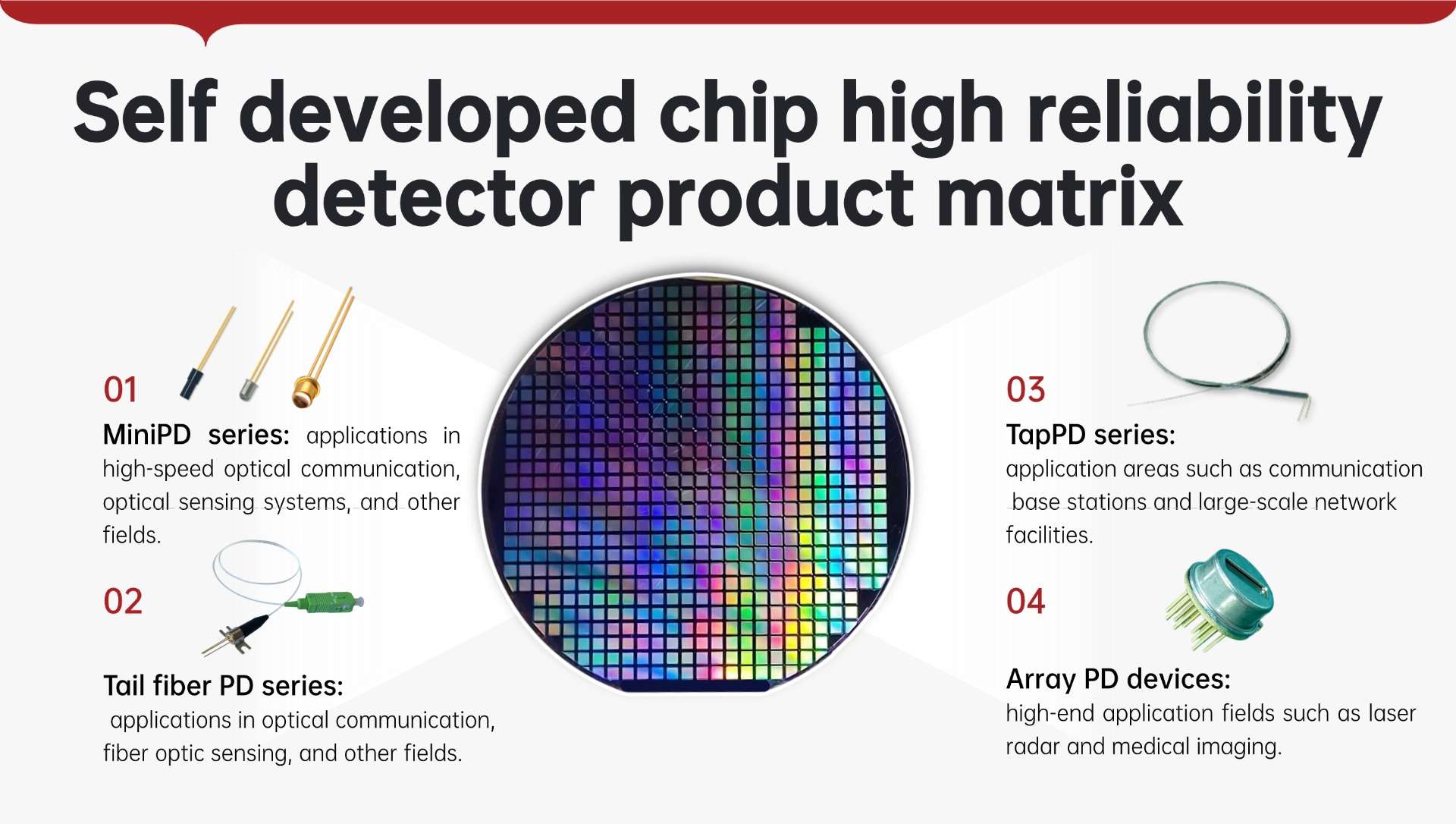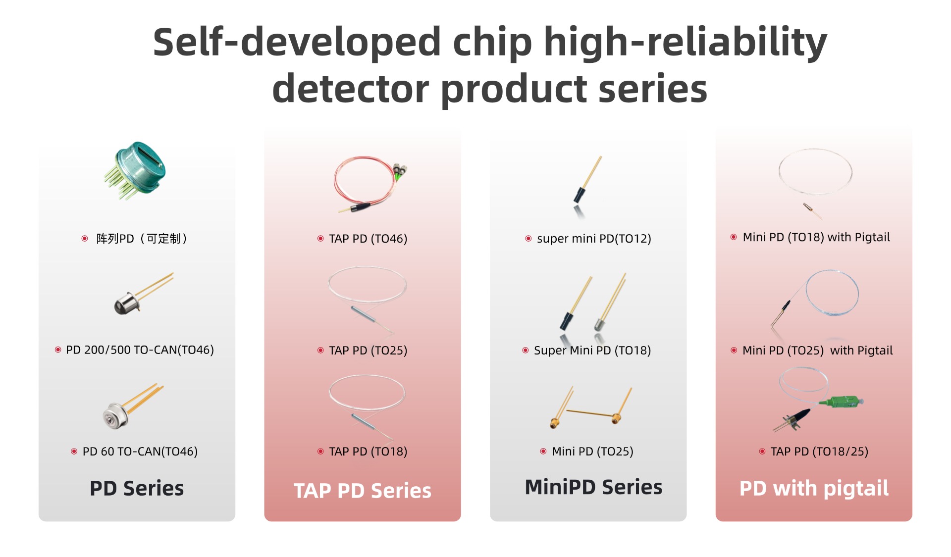 The Photodiode self-developed chip adopts a PIN structure design, which has ultra-low dark current, high reliability, and low voltage operation characteristics. The working temperature range covers -40~+85 ℃, meeting the stable operation requirements in extreme environments.